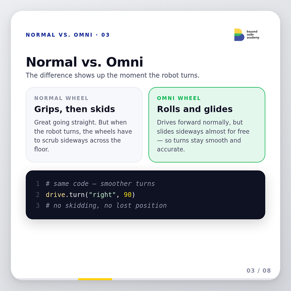 ที่ Beyond Code Academy วิศวกรรุ่นเยาว์จะทำงานกับทั้งสองรูปแบบตามลำดับ เริ่มจากระบบ differential drive เพื่อสร้างความเข้าใจพื้นฐานเกี่ยวกับการควบคุมมอเตอร์และตรรกะด้านทิศทาง จากนั้นเปลี่ยนไปใช้ระบบ omni-directional แนวทางเปรียบเทียบนี้ทำให้พวกเขาเข้าใจข้อแลกเปลี่ยนทางวิศวกรรมอย่างถ่องแท้ — ไม่ใช่แค่วิธีสร้างด้วยล้อ omni แต่เข้าใจว่าเหตุใดมันจึงได้เปรียบในบริบทที่เฉพาะเจาะจง
